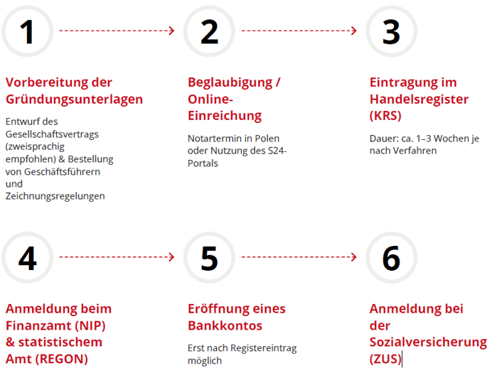• Eintragungspflicht: Die Gesellschaft muss ins polnische Handelsregister (KRS) eingetragen werden.