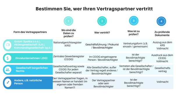 Der erste Schritt besteht darin, festzustellen, ob der Vertragspartner als natürliche Person, die eine wirtschaftliche Tätigkeit ausübt, als Gesellschaft bürgerlichen Rechts oder als Handelsgesellschaft tätig ist. Davon hängt ab, in welchen Registern nach Informationen über die vertretungsberechtigten Personen gesucht werden muss.